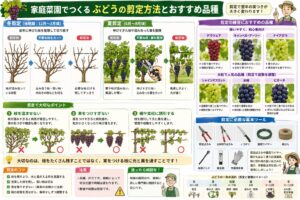 家庭菜園でぶどうを育ててみたいけれど、おすすめ品種はどれを選べばいいのか、育て方や剪定、病害虫対策まで考えると少し迷いますよね。
