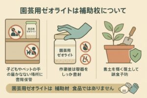 園芸におけるゼオライトの役割は、土壌環境の安定化や肥料効率の改善といった「補助材」です。摂取を前提とした用途ではない点を明確に区別し、表示に従って適切に扱うことが、安心して活用するための近道です。