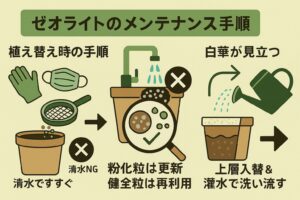 植え替え時に古い用土をふるい、ゼオライトは清水でよくすすぐ(強い塩水での再生は園芸では塩類持ち込みの副作用が大きいため避ける)