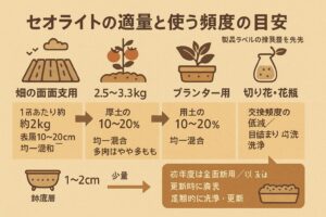 投入量は作物・土質・容器のサイズで変わりますが、プランターでは用土全体の10〜20%混合、畑では1㎡あたり約2kg前後の全面漉き込みが実務上の起点になりやすいです。ゼオライト自体は肥料ではないため、元肥・追肥の設計は併用を前提に調整します。