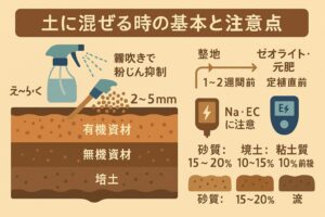 はじめに確認したいのは粒度と含水状態です。一般的な菜園・鉢向けの目安は2〜5mmで、均一な粒径ほど用土中での偏在が起きにくく、通気と保水のバランスが取りやすくなります。微粉が多い場合は、混合の直前に霧吹きで軽く湿らせると粉じんの飛散とダマ化を抑えられます。混合は乾いた用土に対して行い、培土→有機資材(堆肥など)→無機改良材(ゼオライトやパーライト)→元肥の順に層を重ね、最後に全体を切り返すと均一化しやすくなります。水やりの直前に混ぜ込むと、粒子が用土間隙にスムーズに入り込み、ムラが出にくくなります。