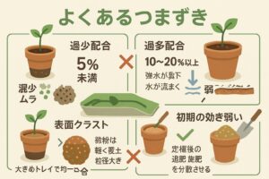 効果を感じにくい原因の多くは、配合の「過少」と「偏在」です。鉢やプランターで5%未満の混合だと、通気や保肥の改善が体感しづらく、逆に多すぎると用土が重くなって水の移動が鈍ります。混合ムラも典型的な要因で、局所的にゼオライトが集中すると、そこだけ水分が滞留して根が寄り付かないことがあります。作業時は大きめのトレイで十分に切り返し、粒が均一に散るまで時間をかけてなじませてください。