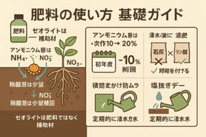 ゼオライトはあくまで「肥効を整える補助材」です。相性が良いのはアンモニウム態窒素を多く含む肥料で、根圏近傍に保持して徐々に供給する緩衝役として働きます。硝酸態窒素は陰イオンであり、ゼオライトによる保持は基本的に期待できないため、硝酸主体の液肥は灌水サイクルに合わせた少量頻回施用が合っています。