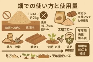 施用頻度は永続材に近いため毎回必須ではありません。畑は初年度に全面施用し、以後は更新や追加入れ替えのタイミングで少量を補う運用が現実的です。