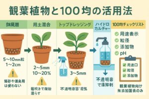 猫砂や消臭用ゼオライトには香料などの添加物が含まれる製品もあるため、観葉植物には使用しません。100均の園芸コーナーにある無添加の園芸用またはハイドロ用表示の製品に限定すると安全です。効果を確認できたら、大袋(同等粒径・同等規格)へ切り替えるとコスト効率よく継続できます。