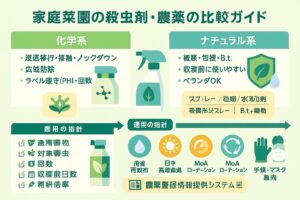 作物や発生ステージが入り混じる家庭菜園では、害虫管理の基盤を「化学系(合成有効成分)」と「ナチュラル系(食品・天然由来)」に大別して設計するのが実務的です。化学系は接触・摂食・浸透移行などの作用で短時間に密度を下げやすく、適用害虫の幅が広い一方、適用作物・使用回数・収穫前日数などの条件が明確に定められていると説明されています。ナチュラル系は物理作用や生物的作用が中心で、収穫直前にも使いやすい製品が多いとされ、ベランダや屋内近接でも取り回しやすいのが長所です。
