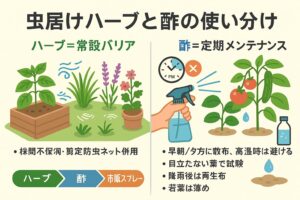 • 忌避は万能ではないため、物理防除(防虫ネット、シルバーマルチ)や見回りと組み合わせます。