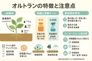 以上の点を踏まえると、オルトランは「初期予防」としての粒剤、「局所対処」としての葉面散布を適切に切り替え、ラベル条件の範囲内で計画的に使うと扱いやすい資材です。