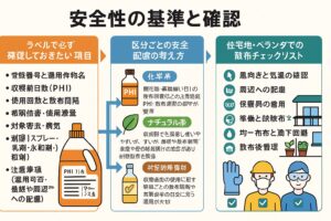まず確認すべき拠り所は、各製品ラベルに記載された公的情報と使用条件です。日本では農薬取締法の枠組みのもとで登録番号、適用作物、毒劇区分、使用時期、使用回数、収穫前日数(PHI)、希釈倍率、剤型などが表示され、普通物に分類されている製品であっても、用法・用量の順守が前提とされています。登録の有無や適用範囲は、公的データベースで検索できるよう整備されていると案内されています(出典:農林水産省 農薬登録情報提供システム https://pesticide.maff.go.jp/)。
