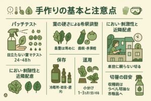 手作りスプレーは原料のロット差、室温、浸漬日数、ろ過の精度など多変量の影響を受けます。したがって、はじめに目立たない葉でパッチテストを行い、24〜48時間で葉縁の褐変、クロロシス、しおれなどの薬害指標が出ないかを確認するのが安全策です。柔らかい葉(レタス、ハーブ類、ベビーリーフ)は硬葉種(トマト、ナス、柑橘)に比べて薬害許容量が低い傾向にあるため、希釈倍率を一段高く設定して様子を見ます。