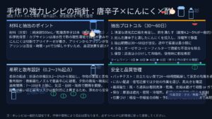 唐辛子は乾燥品で十分機能しますが、種子部はカプサイシン濃度が高く刺激が強くなる傾向があるため、初回は種を除いて刻み、二回目以降に調整すると安全側です。にんにくは包丁の腹で軽く潰し、酵素反応を起こしてから投入します。浸漬は冷暗所で30〜60日、時々軽く振盪して拡散を促し、ガス発生や異臭がないかを点検します。