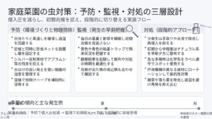 家庭菜園では、予防・監視・対処の三層で設計すると選択肢を整理しやすくなります。環境づくりと物理防除で侵入圧を減らし、日々の観察で初期兆候を捉え、被害レベルに応じて段階的に手段を切り替える流れが実装しやすい考え方です。