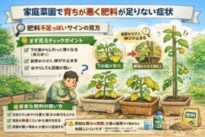 家庭菜園で育ちが悪いときは、焦って何かを足すより、まず肥料(足りない/多すぎる)と水やり(多い/少ない)を整理して、次に日当たりとプランター環境、最後に徒長や連作障害のような中長期の原因を見ていくのが近道です。