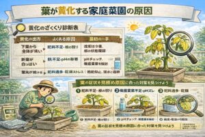 葉が黄色くなる(黄化)は、家庭菜園で育ちが悪いときにいちばん多いサインのひとつです。ただ、原因が幅広いので、症状の出方であたりを付けるのが近道です。