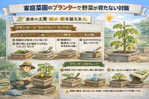 プランターで野菜が育たないときは、まず土量・排水・根の3点セットを疑います。地植えよりも環境変化が激しいので、ちょっとしたミスが育ちの差になりやすいです。