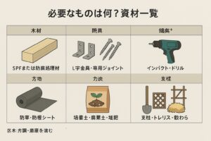 花壇の木枠DIYをスムーズに進めるためには、あらかじめ資材と工具を揃えておくことが欠かせません。以下に代表的な必要資材を一覧化しました。