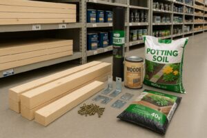 このほか、水平器やスコップ、軍手、マスクといった補助的な道具も準備しておくと、作業効率と安全性が向上します。特にビス止め作業ではインパクトドライバーがあると施工時間が大幅に短縮され、強度の安定した組み立てが可能です。購入前には、枠の大きさから必要な土量を計算し、車載できる重量や袋数を考慮して輸送計画を立てておくことが無駄を防ぐポイントです。例えば120×80×20cmの枠を作る場合、培養土40L袋が約5袋必要になります。複数区画を作るなら積載量の限界を確認し、必要に応じて配送サービスを利用するのが現実的です。