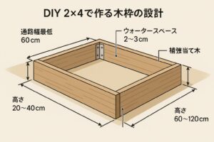 2×4材は入手しやすく価格も手頃で、強度と加工性のバランスに優れた定番素材です。特に家庭菜園の枠組みには十分な剛性を持ち、DIY初心者でも扱いやすい点が魅力です。設計段階では、いくつかの寸法を慎重に検討することが大切です。