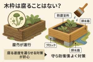 耐久性を高めるための対策はいくつかあります。まず、全面に防腐塗料を塗布し、特にエッジや切断面まで塗り込むことが基本です。これにより、外気や水分の浸透を遅らせることができます。さらに、木枠が直接地面に触れないようにブロックや防草シートの上に設置すると、腐朽リスクを軽減できます。内側に防湿・防根シートを立ち上げて留める方法も効果的で、土と木材が直接接触する時間を減らすことにつながります。また、適切な排水路を確保して常に水はけの良い状態を維持することも、耐久年数を延ばす大切な要素です。