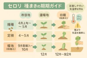 目安として、温暖地では春まき(4~5月播種、7~8月定植、10~12月収穫)が一般的です。冷涼地では春の苗定植から夏どり、暖地の一部では秋植えで冬越しする方法もあります。地域や年の気候で前後するため、最高・最低気温の推移を基準に調整してください。