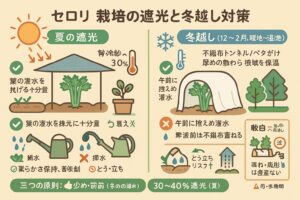 一方、冬越しは地域の寒さと栽培ステージの見極めが前提です。暖地~温暖地なら、不織布のトンネルやベタがけで放射冷却を緩和し、株元には厚めの敷きわらで根域を保温します。低温期は乾燥しすぎても根の活動が鈍り、芯部の障害が出やすくなるため、午前中の控えめな潅水で根を動かし、日中に乾きすぎない状態を保つのがコツです。幼苗期に強い低温(概ね12〜13℃以下)が続くと花芽分化が進み、春先のとう立ちにつながることが知られているため、寒波の前は不織布を早めに重ね、夜間の冷気を避けます(出典:岡山県「セルリー(セロリ)の栽培方法」https://www.pref.okayama.jp/uploaded/life/55809_191203_misc.pdf)。