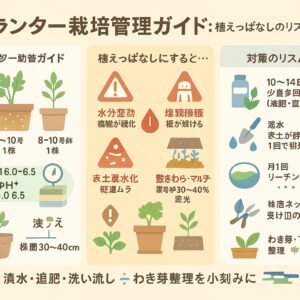 乾燥は硬化の近道です。マルチや敷きわらで表土の温度・水分を安定させ、乾いたらたっぷり、を徹底します。高温期は特に朝の潅水で株の負担を減らします。