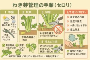 作業直後の潅水は、切り口に水をかけないのが基本です。株元へ土面灌水で与える場合でも、量は控えめにし、夕方以降の軽い水やりにとどめます。株が乾きすぎているときは、朝の涼しい時間帯に株元だけへ行い、葉面や切り口を極力濡らさないようにします。わき芽管理と下葉かきを継続すると、光と風が株内部まで届き、蒸散のバランスが整って根の吸水も安定します。その結果、葉柄(食用部)の細胞間隙が過度に発達せず、繊維が緻密にそろい、筋っぽさの低減につながります。