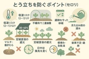 とう立ちは、幼苗期に一定期間の低温に遭遇することで花芽分化が進み、その後の長日条件で抽だいが促進される現象です。セロリでは幼苗期におおむね12〜13℃以下の低温が続くとリスクが高まり、移植時の根傷みや極端な乾燥・肥料切れといったストレスも誘因になります。苗を若い段階で寒風や霜から守り、夜間の保温と日中の通風・採光を両立させる管理が有効です。
