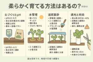畑での改善は次作からの対策が中心です。水切れと肥料切れ、真夏の直射、過熟・霜当たりは硬化の大きな要因です。下表を参考に原因と対処を整理してください。