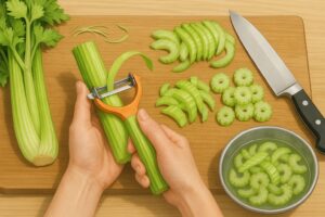 畑で硬く仕上がったセロリでも、下処理と熱の入れ方を工夫すれば、心地よい食感と香りに整えられます。最初に行いたいのは筋取りと厚みの統一です。太い外側の筋は根元側の節から上方向へピーラーで引き、刃先で残った筋をそぐように外します。切り方は繊維を断ち切る輪切りや薄い斜め切りが基本で、厚みは2〜3mmを目安にそろえると、火通りが均一になり口当たりも安定します。切った後は冷水に1〜2分だけさっとさらすと歯ざわりが軽くなりますが、香り成分も抜けやすいため浸し過ぎは避けてください。