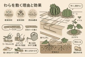 運用のコツとしては、敷き始めに軽く散水して土とわらを密着させる、端部に薄く土をのせて固定する、U字ピンや麻紐で数点を押さえる、などの初期安定化を行うと風での飛散が減ります。わらは雨で一時的に含水しますが、繊維間隙によって乾燥も進みやすいため、過湿が続きにくいのが特長です。以上の点を踏まえると、わら敷きは省管理と病害予防、品質向上を同時にねらえる合理的な手段だといえます。