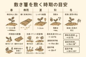 時期判断で迷ったら、次の指標が役立ちます。最低気温が安定して二桁に乗る頃から被覆域を広げる、連続降雨が見込まれる前に泥はね対策として早めに敷く、猛暑予報の前に厚みを増す、といった先手の対応です。一方で、台風前は固定を増やすか、一部を外して資材損耗を避けるなど、気象イベントごとのリスク管理も合わせて検討してください。こうした季節運用を繰り返すことで、わら敷きは「敷く量と時期を調律して効かせる」管理技術へと成熟していきます。