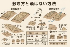 風で飛ばされにくくするには、敷いた直後にジョウロで軽く湿らせて土となじませ、端部に薄く土をかぶせます。U字ピンや針金、麻紐で数点を軽く押さえると安定します。風の強い畑では、風上側に背丈のある作物や簡易の風よけを設けるとわら自体が飛びにくくなります。重みのあるバークチップを少量混ぜる方法も一案です。厚みは目的により変え、日射が強い夏場はやや厚め、春や過湿期は薄めを心がけます。厚くし過ぎると根が浅くなり乾燥に弱くなるため注意が必要です。