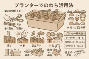 プランターサイズ | わらの切断長 | 被覆厚の目安 | 固定ピンの本数 | 点検頻度の目安 |