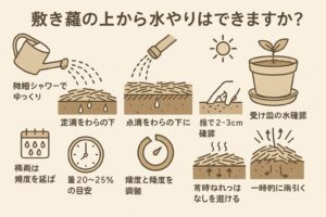 根の健全性を守るには、潅水の「量・速度・頻度」のバランスが鍵です。量は「用土全体が湿り、鉢底から排水が出るまで」を目安とし、速度は表層に滞留しない程度の緩やかな流量に調整します。頻度は季節・作物・生育段階で変わるため、葉の張りや土壌水分の実測に基づいて可変にします。わらが常時濡れたままになると、地際部の通気が悪化しやすいので、日中に表層が軽く乾くリズムを作ると病害リスクを抑えられます。必要に応じてわらを一時的に間引き、株元の露出を増やしてガス交換を促す調整も有効です。