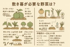 資材の組み合わせによる相補性も活用できます。例えば、定植初期は黒色フィルムマルチで地温を確保し、盛夏入りに合わせてフィルム上に薄くわらを重ねると、昇温を抑えつつ保湿と泥はね抑制の両方を狙えます。スイカ・カボチャなど果実が地面に触れる作物では、果実直下にわらを敷くことで接地面の汚れと腐敗リスクを下げられ、通気の良いクッション層としても機能します。