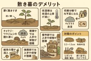有機マルチとして優れた面が多い一方で、運用を誤ると逆効果になる場面があります。まず、厚く敷き過ぎると土表面の気体交換が滞り、細根が地表近くに偏って浅根化しやすくなります。浅根化は乾燥や高温の局所変動に弱く、潅水や施肥のムラも生みやすくなります。目安として、露地の一般的な被覆厚は1〜3cm、プランターでは0.5〜1.5cmから開始し、気象と生育を見ながら加減すると過剰になりにくいです。