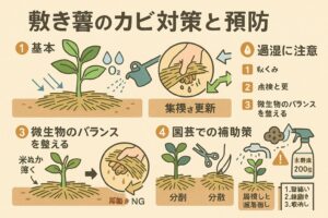 物理的・栽培的な補助策としては、株間を広げて空気の通り道を確保する、支柱や剪定で地際の風抜けを良くする、潅水を一度に多量ではなく分割して与える、雨天後はわらを一時的に間引く、といった現場対応が有効です。要するに、わら・水・空気の三要素のバランスを常に点検し、過湿が続かないリズムを作ることが、カビの抑制と根圏の健全化につながります。